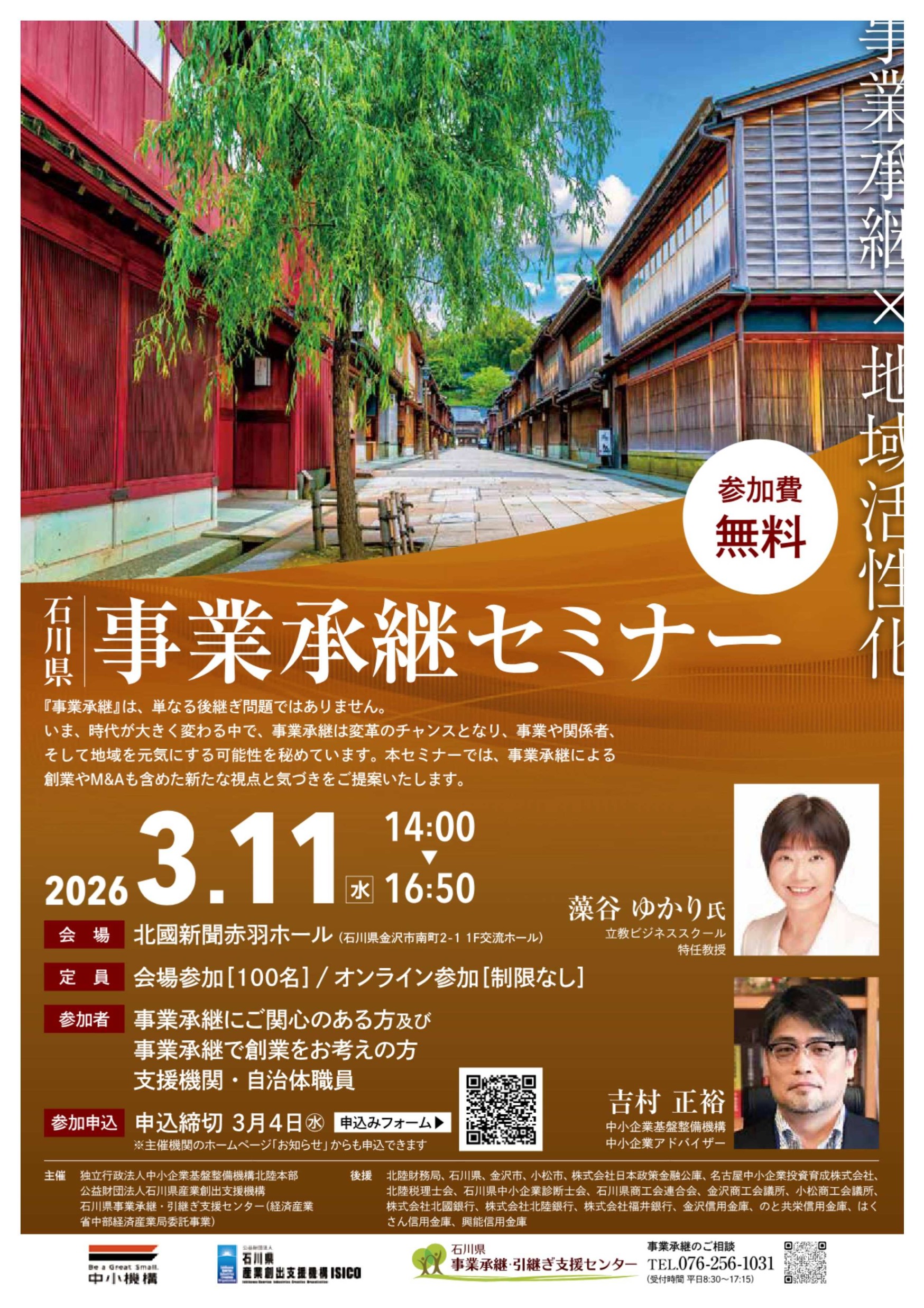 セミナーのご案内 『石川県事業承継セミナー』~事業承継×地域活性化~(中小機構主催)