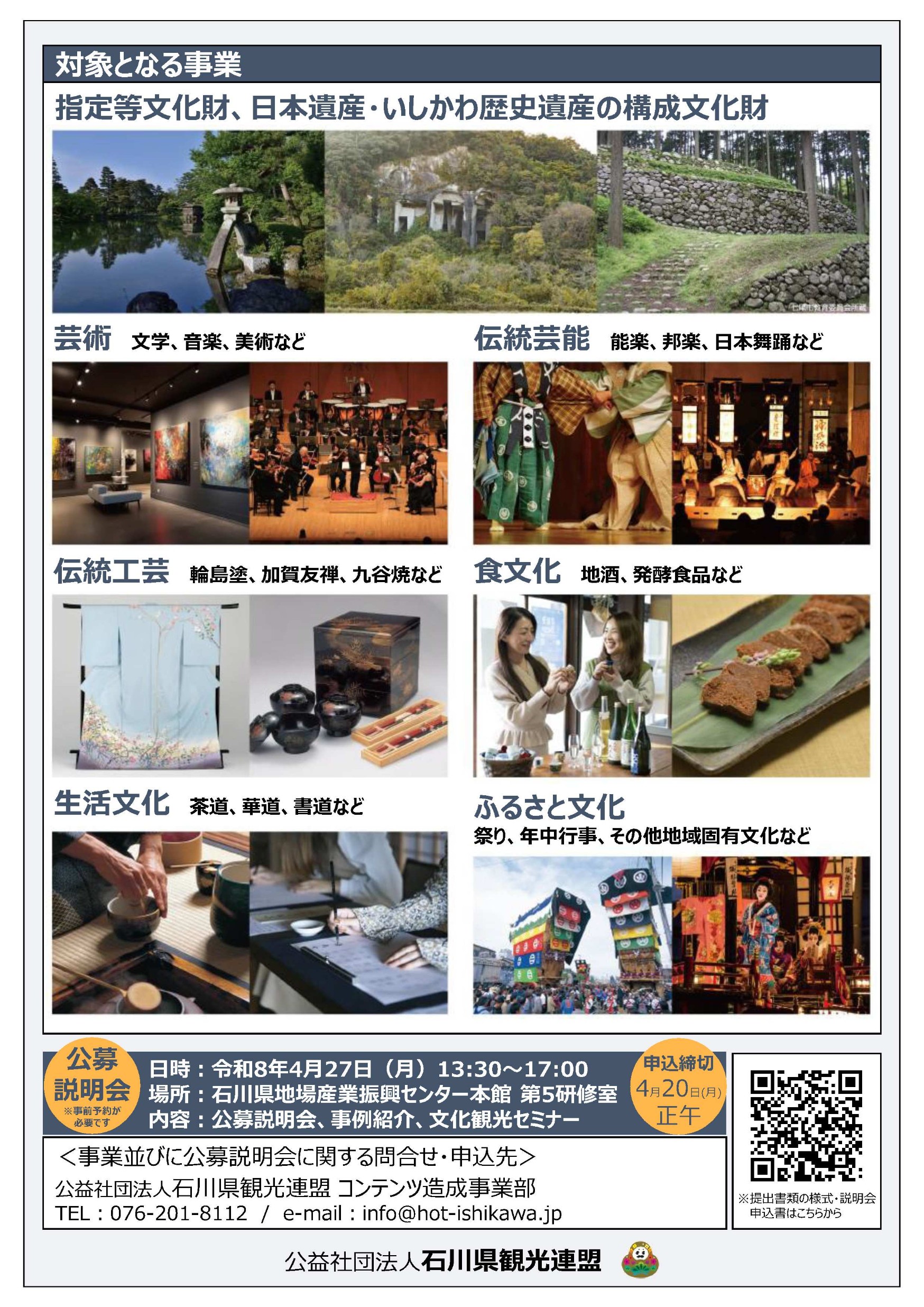 【公益社団法人石川県観光連盟】令和8年度いしかわ文化観光コンテンツ造成支援事業、公募説明会・文化観光コンテンツづくりセミナーのご案内